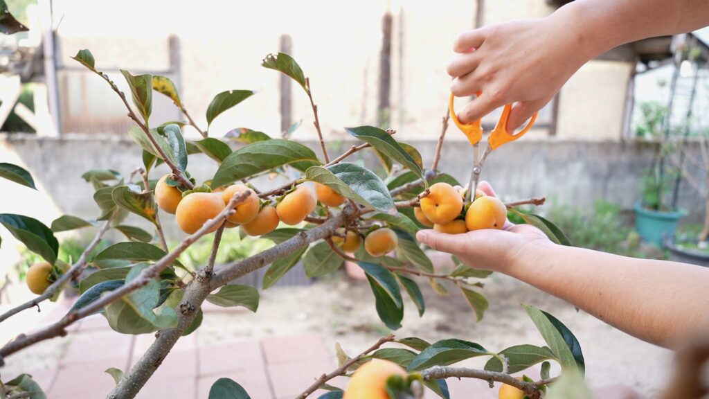 今回はカキの鉢植え栽培で「開心自然形」の仕立て方を実演していくよ!