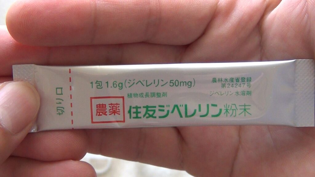粉末(ジベレリン50㎎)小袋を水500mlに溶かせば調整完了です。