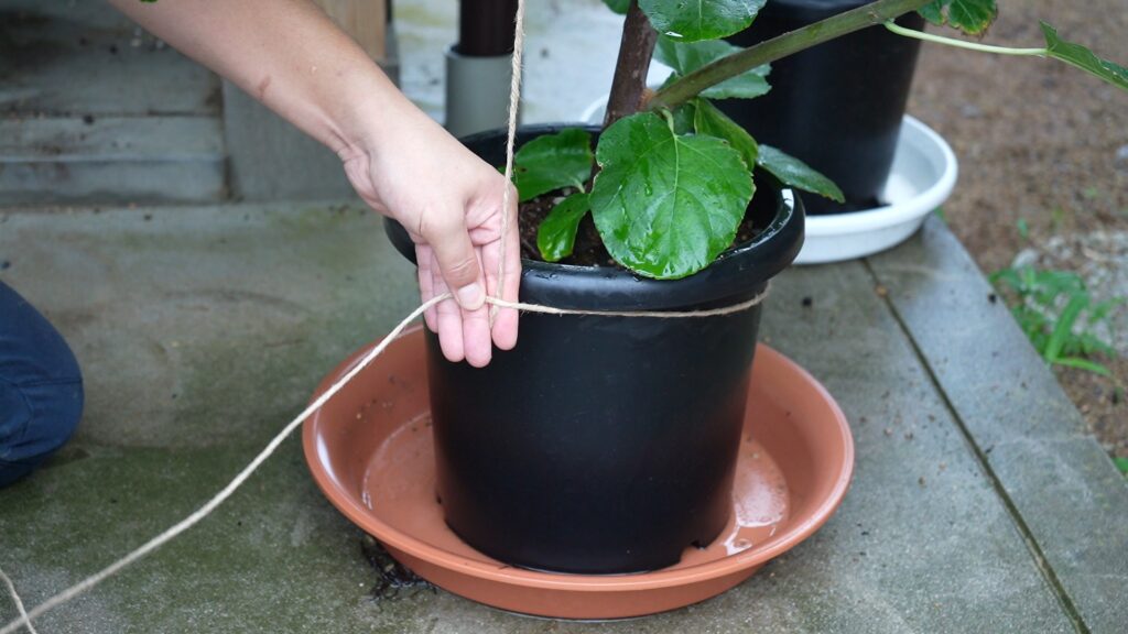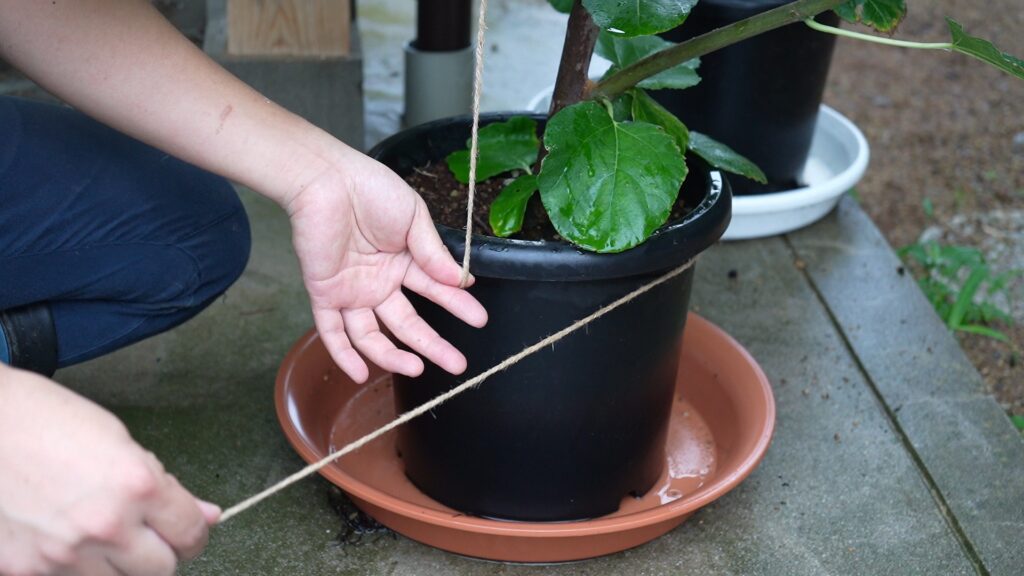 ②ひもを下方向に引っ張りながら、鉢の縁で1週させます。