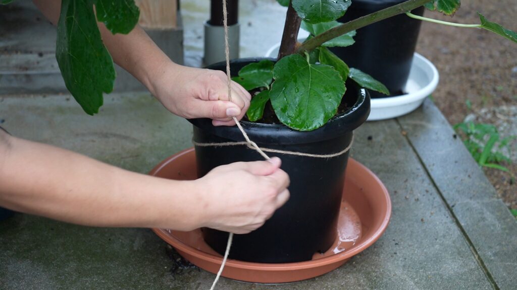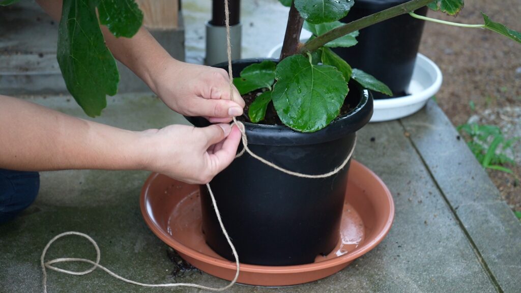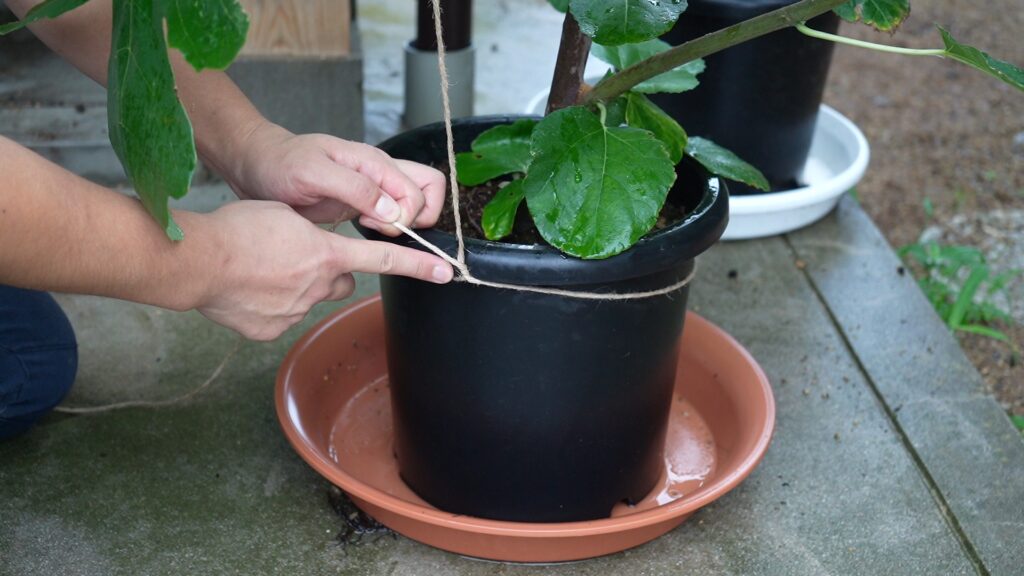 そんな時は植木鉢の縁を活用した簡易誘引法が便利!