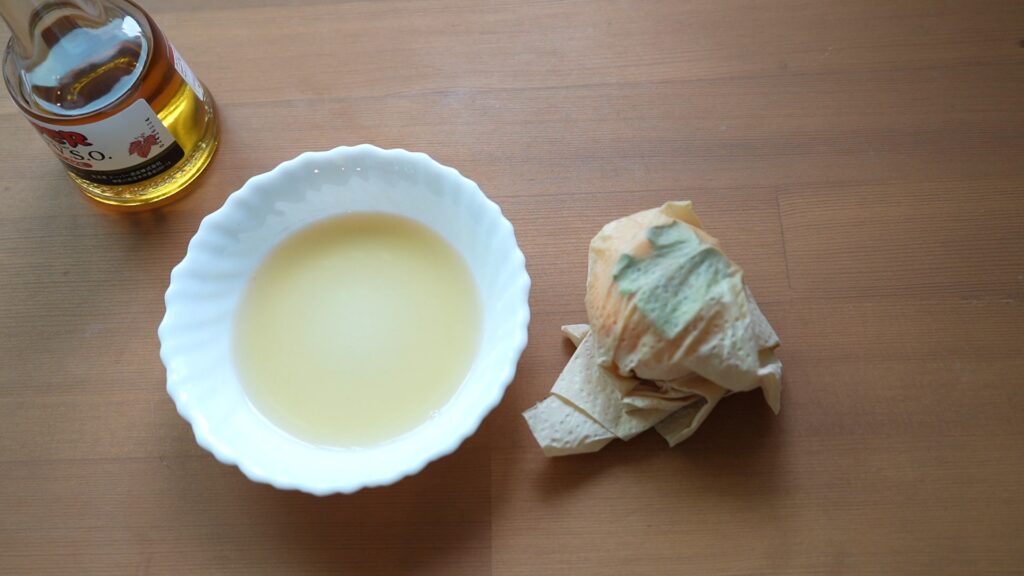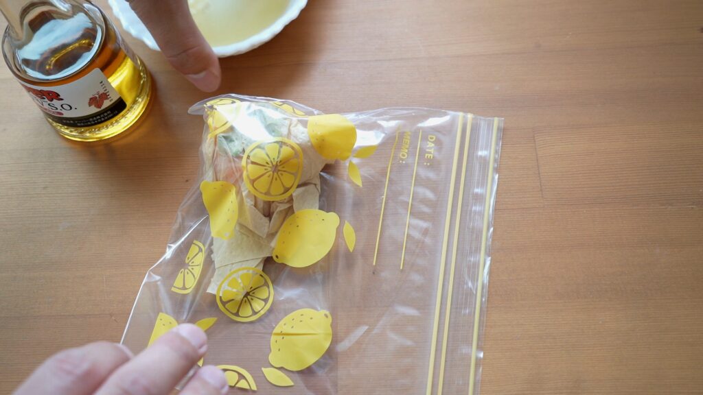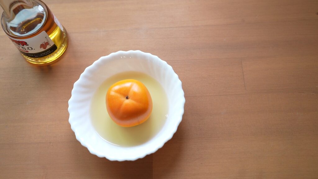 アルコール脱渋は、アルコール度数40度前後のお酒をヘタ部分に浸け、ビニール袋やジップロックなどで密閉保管する方法です。